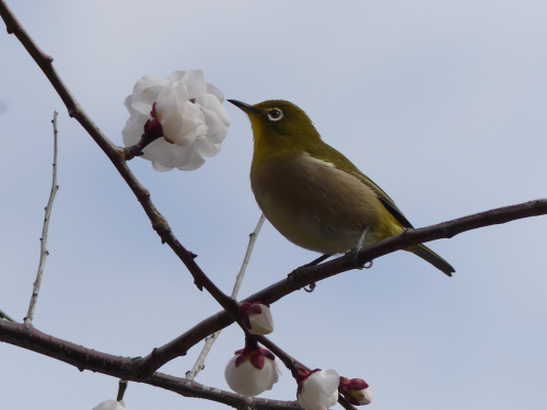 黄緑の体色は紅梅にも白梅にも映え目に美しく、